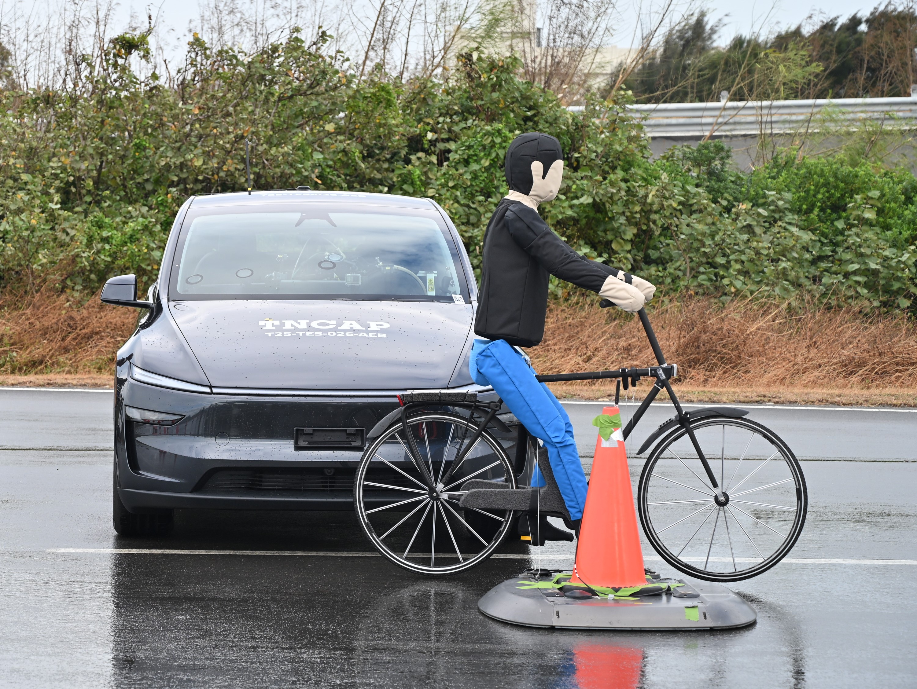 1. 緊急煞車輔助系統(自行車情境試驗):模擬車輛行進間突遇自行車騎士穿越道路的情境,評估該系統能否主動偵測並提供輔助煞車功能,期能避免碰撞風險或減輕碰撞傷害。